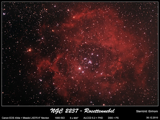 nach längerer Forumsabstinenz möchte auch ich ein Ergebnis meiner letzten Fotonacht präsentieren. Diese 5 Frames sollten ja nur die Ergänzung der bereits am 28.12. geschossenen Aufnahmen mit je 10 min. Belichtungszeit sein. Habe bei diesen aber beim Einrichten etwas geschlampt sodaß im gestackten Bild der obere Teil des Nebels abgeschnitten wird und ich mich entschied nur diese 5 Frames zu verwenden.